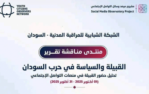 نظّمت الشبكة الشبابية للمراقبة المدنية (YCON)، في 11 يناير 2026، منتدى حواريًا لمناقشة تقريرها الصادر حديثًا بعنوان “القبيلة والسياسة في حرب السودان”، وذلك عبر منصة (زووم)، مع بث مباشر على صفحتها في موقع فيسبوك، وبمشاركة نخبة من الباحثين والكتّاب والمحللين السياسيين والإعلاميين.