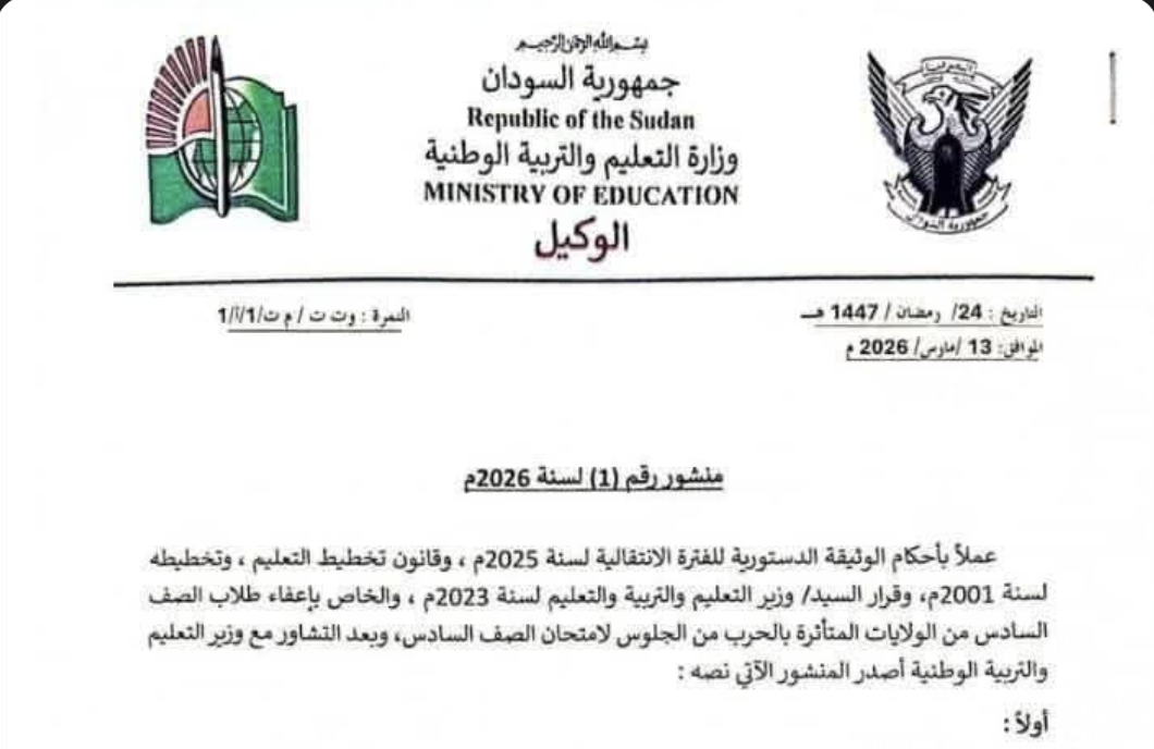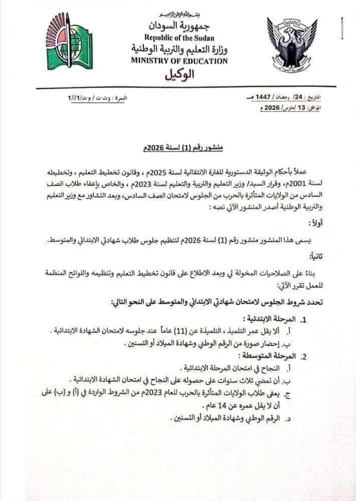 وبحسب المنشور الذي أصدرته الوزارة بتاريخ 13 مارس، فيما يتعلق بالطلاب المتأثرين بالحرب، فقد نص على إعفاء طلاب الولايات التي تأثرت بالحرب خلال العام 2023 من شرط النجاح المسبق والمدة الزمنية بين المرحلتين، على أن لا يقل عمر الطالب عن 14 عاماً عند الجلوس للامتحان، مع ضرورة إبراز الرقم الوطني وشهادة الميلاد أو شهادة التسنين.